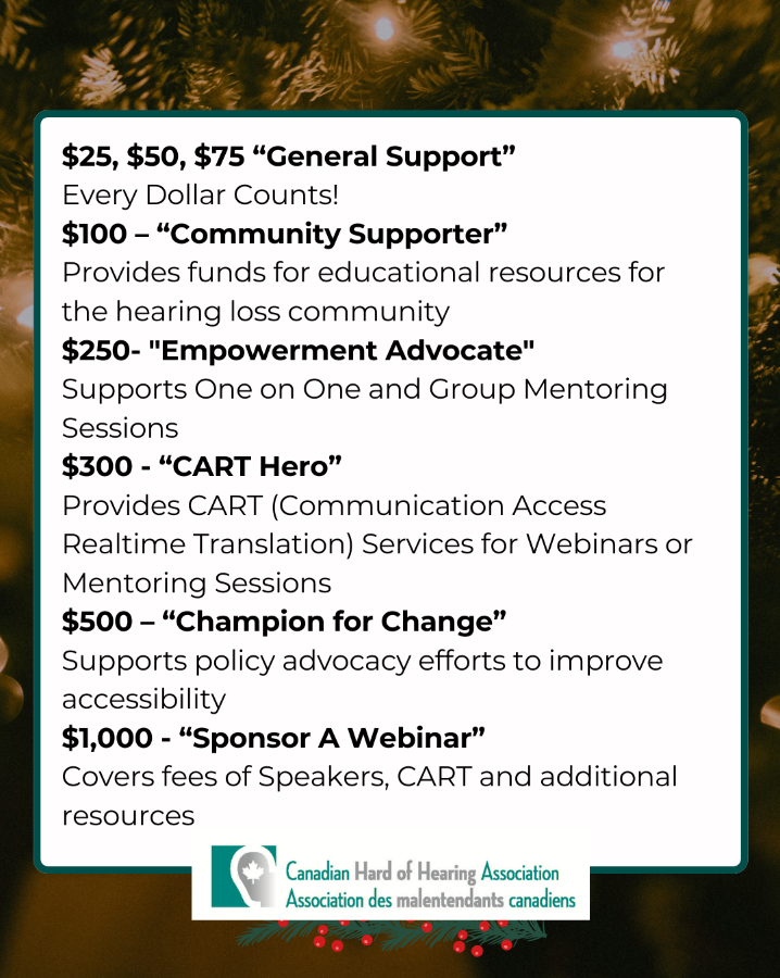 This holiday season, help us reach our goal of $20,000 to fund essential programs and services for Canadians with hearing loss.